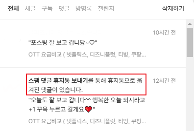 왜냐면 "스팸 댓글 휴지통 보내기"라는 알림과 함께 댓글들이 숨겨진 상태였단 말입니다!