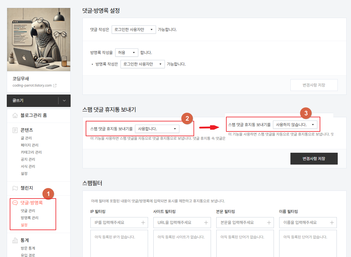 2. 스팸 댓글 휴지통 보내기가 기본으로 사용 중인데요.