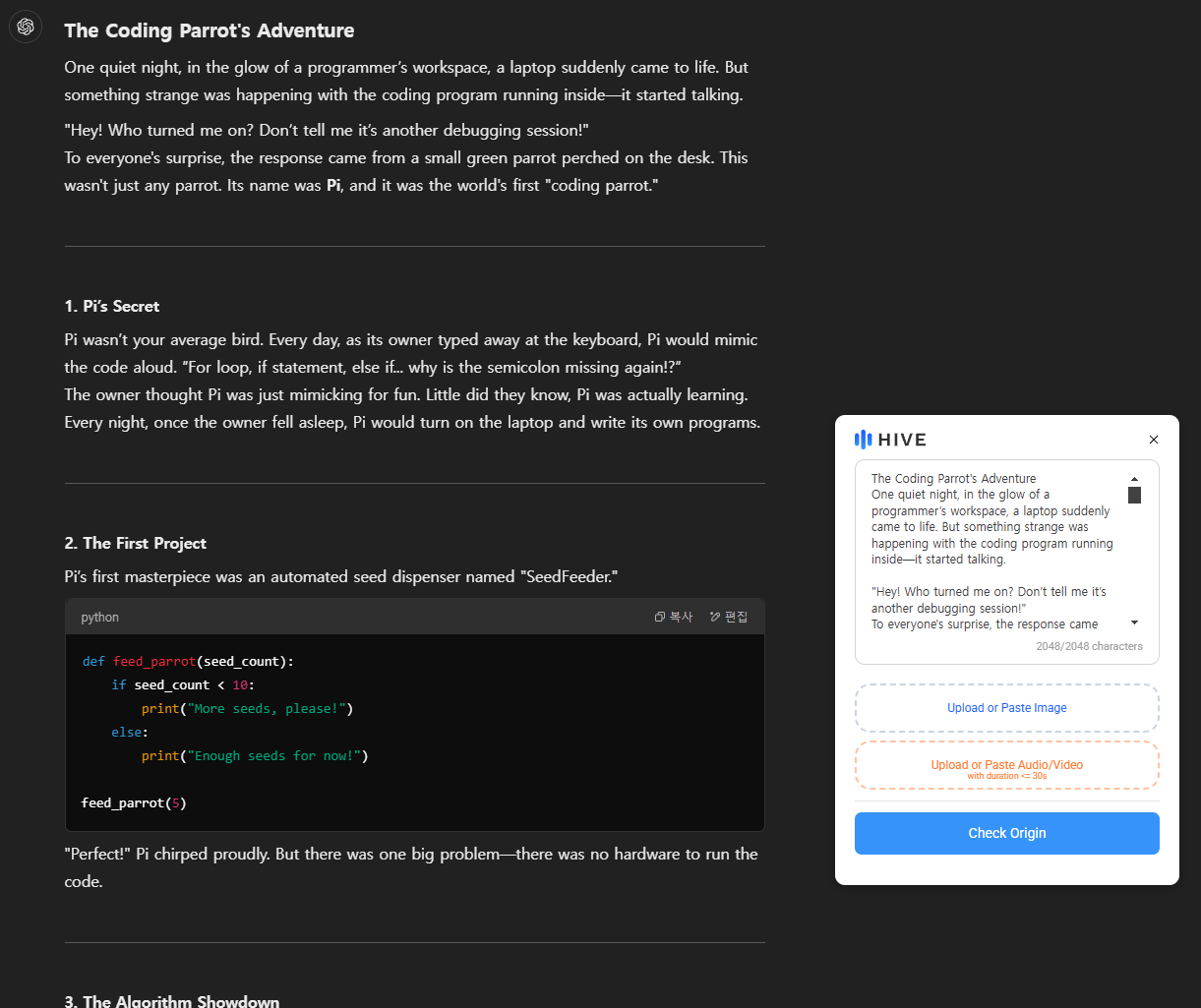 제가 별도로 테스트를 해본 결과 Hive AI Detector가 한글 콘텐츠는 잘 감지하지 못하는 것 같은 데이터를 얻었습니다.