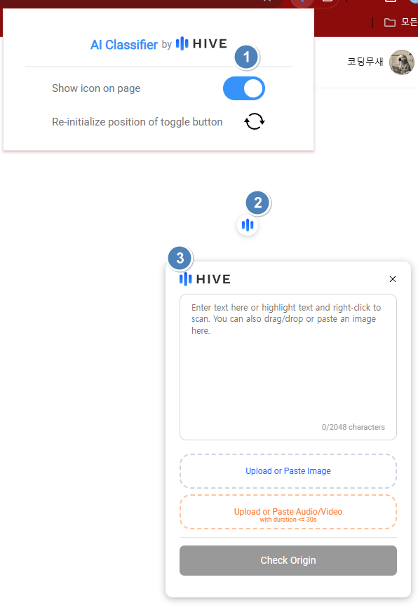 설치를 완료하시면 크롬 주소창 옆에 Hive AI Detector 아이콘이 생깁니다.
