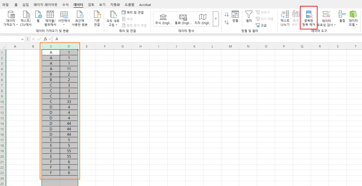 C/D 두열을 지정했기 때문에 두열의 값이 모두 중복되는 데이터만 제거되었습니다~