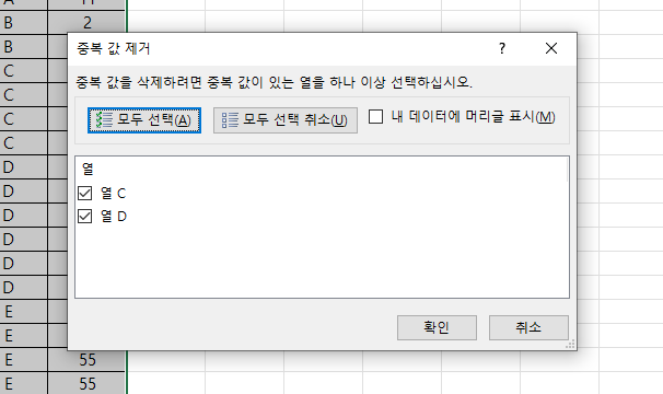 전 지정한 C/D 열 모두 선택하여 확인 버튼 눌러줬습니다.