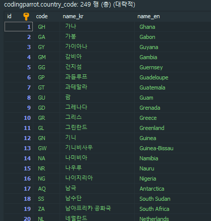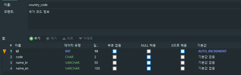 국가 코드를 저장할 테이블입니다.