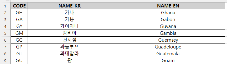 고유값 | 국가코드 | 한글 국명 | 영문 국명