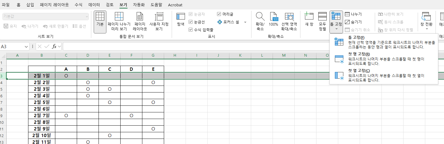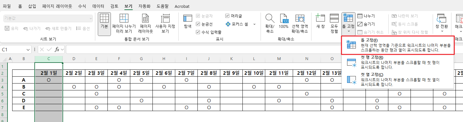 고정을 원하는 열(B) 오른쪽의 열(C) 선택 > 보기 > 틀 고정