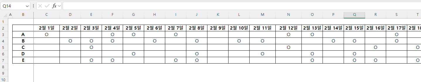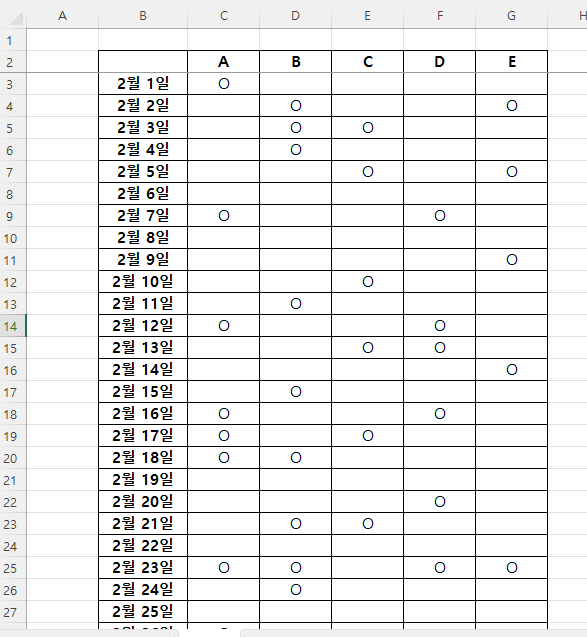 해당 열(B)을 기준으로 고정이 되어 스크롤을 이동해도 A~E 값을 볼 수 있습니다.