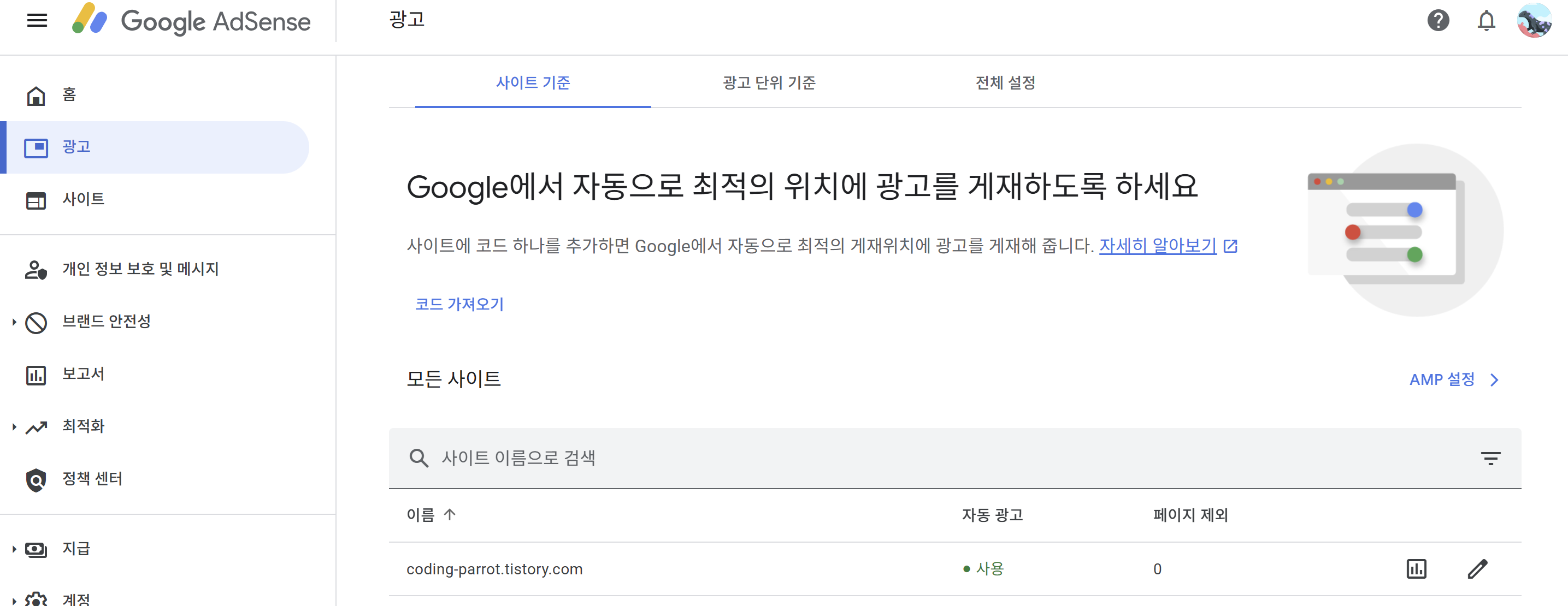 애드센스에 접속 후 좌측 탭에서 광고를 클릭 해주세요.