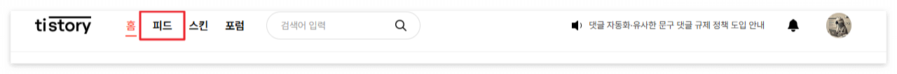 티스토리 상단 네비게이션 바에 "홈 / 피드 / 스킨 / 포털" 메뉴가 있습니다.