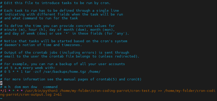 */1 * * * * /usr/bin/python3 /home/my-folder/cron-coding-parrot/cron-test.py >> /home/my-folder/cron-coding-parrot/cron-output.log 2>&1